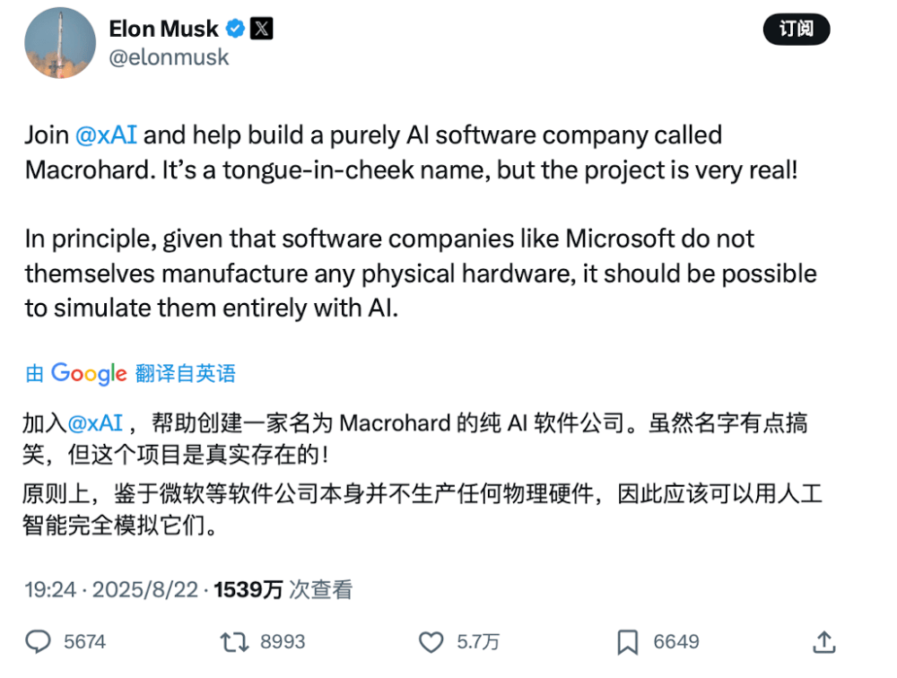 据马斯克透露,Macrohard并非空中楼阁,而是xAI正在推进的一项真实项目。该项目旨在打造一个完全由AI驱动的软件公司,这一想法源于马斯克对现代软件公司的深刻洞察。他认为,像微软这样的软件巨头,其主要业务并不涉及物理硬件的生产,而是专注于软件开发。因此,从理论上讲,这样的公司完全有可能被高度智能化的AI系统所模拟和替代。